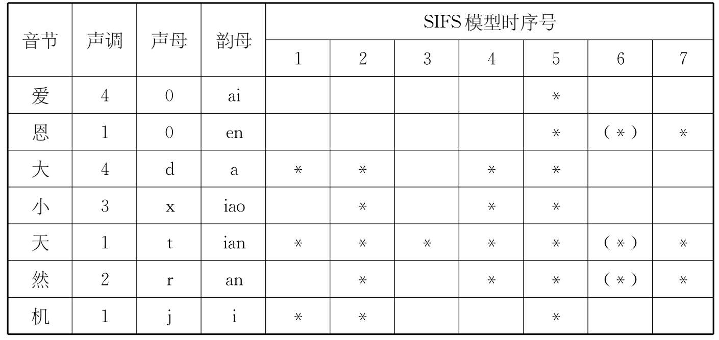 表1 一些音节的声母、韵母及其在SIFS模型中的配列