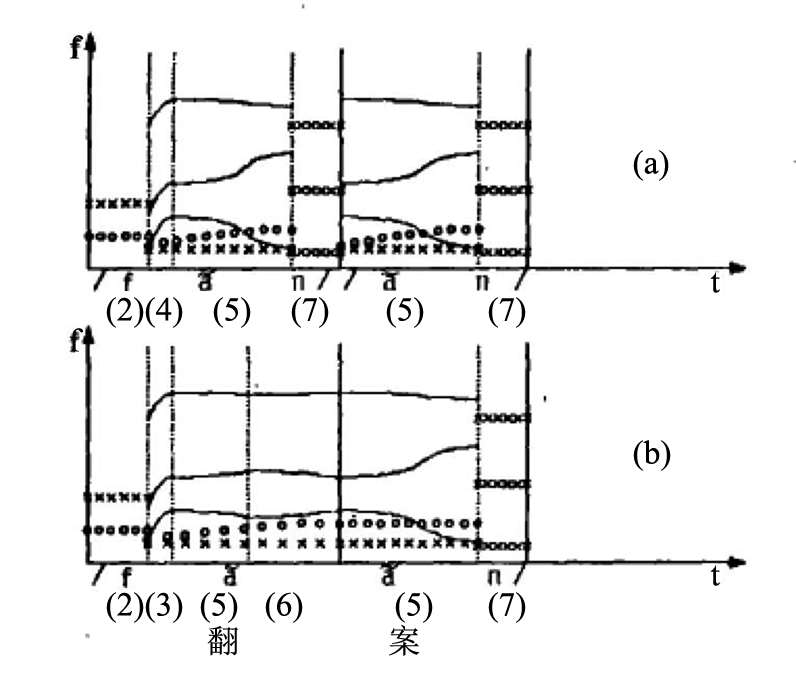 图2示出了合成单音节“翻”/fan/和“案”/an/(图a)以及双音节词“翻案”/fan an/(图b)时各音段的控制参数。图中,竖实线表示音节界线;竖虚线表示音段界线;实曲线自下而上分别表示共振峰频率F1、F2和F3的轨迹;XXX线表示鼻音或鼻化元音的极点频率轨迹;OOO线表示零点频率轨迹。为便于比较,音节时长方面没有处理。根据协同调音规则,合成双音节的前音节时:(1)增添后过渡段,取后音节元音/a/的共振峰频率作目标值;(2)前音节鼻尾脱落,后音节元音被鼻化;(3)后音节元音/a/的共振峰频率降低与前音节的共振峰平滑衔接。这样一来,就比较圆满地模拟了语流中音节间的协同调音效应,改善了合成词语的流畅性。