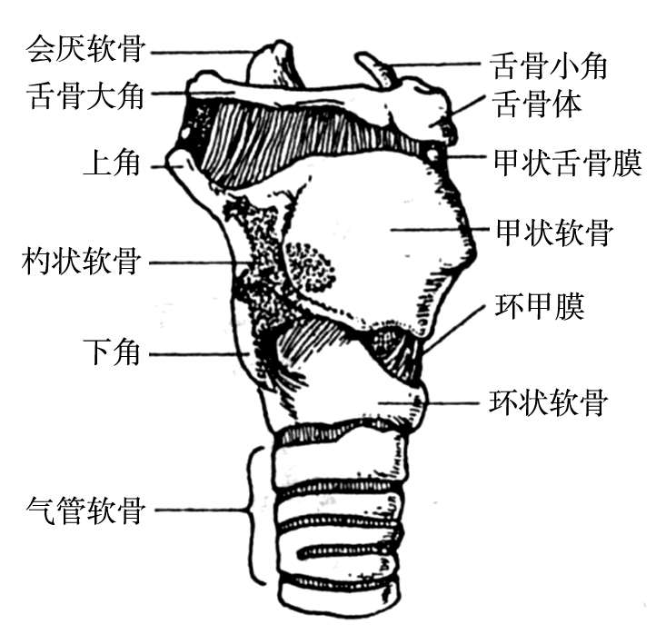 从外表看,颈部正中突起的一块,就是喉头。这一部分上通咽喉,下接气管,是由许多软骨衬着一些黏膜互相连接起来造成功的。这些软骨的名字是:甲状软骨,环状软骨,杓状软骨(又称披裂软骨或破裂软骨)。