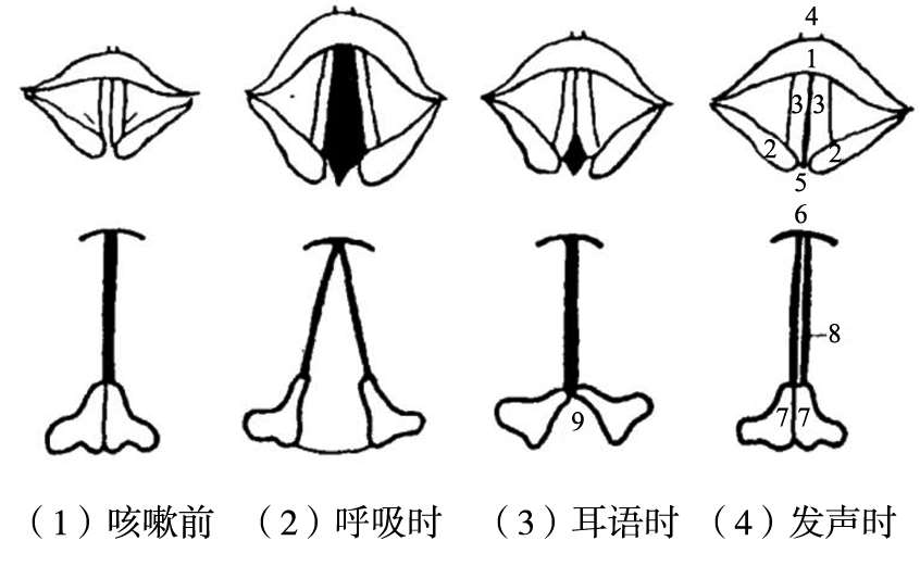 (上图表示喉头镜中所见喉的入口的一部分,下图表示甲状软骨与杓状软骨之间声带开合的情况)