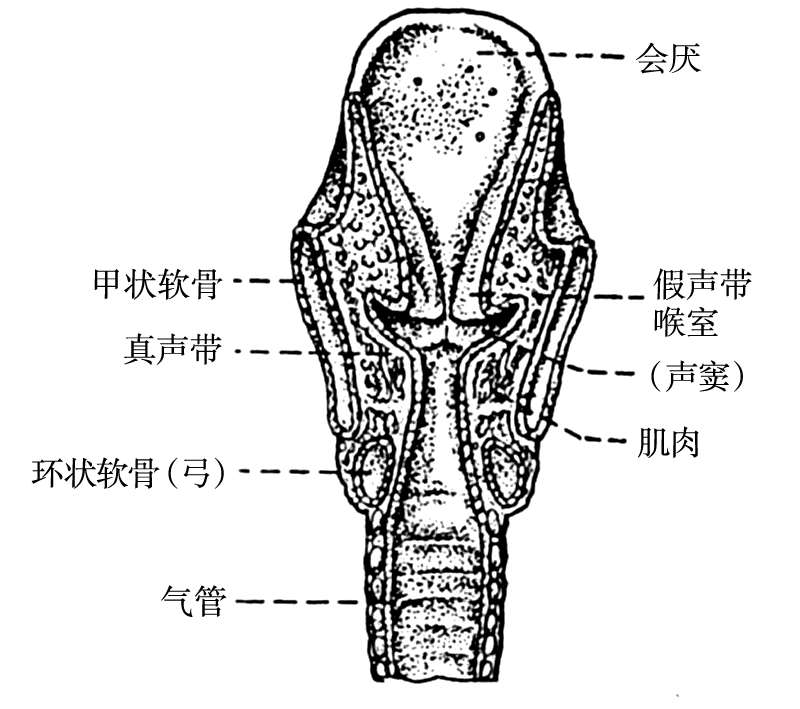 喉部两旁的黏膜并不是平坦得像个筒儿似的。有两处皱起,做成皱襞,形成两对门户,上一对门户关不拢,在发音上也不很重要,叫做 假 声带 ;下一对形似两唇,是发音上最重要的器官,这就是咱们上面说的,人类发音的颤动体—— 真声带 。这一对声带,左右能分开,也能并合。中间的通路叫做 声门 ,依声带的张缩而开闭:在真假两声带之间,左右还各有一个小窦,叫做 喉室 ,也可以叫做 声窦 ,从声门出来的声音在这两窦间能够发生反响。