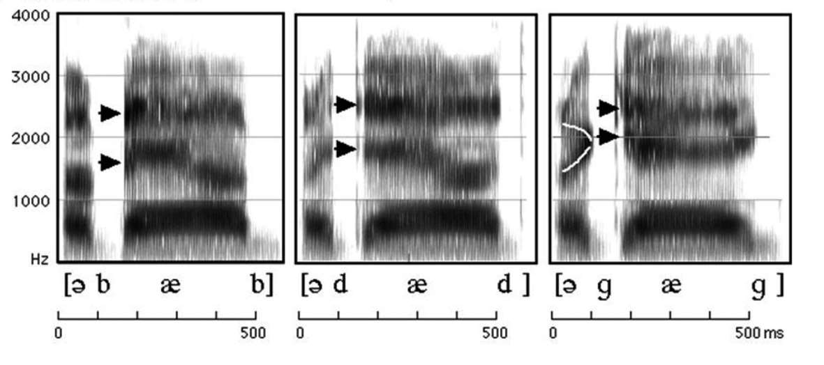 。共振峰起始点决定于邻近元音。这是因为跟辅音闭塞无关的舌头部位大多是邻近元音的调音部位。