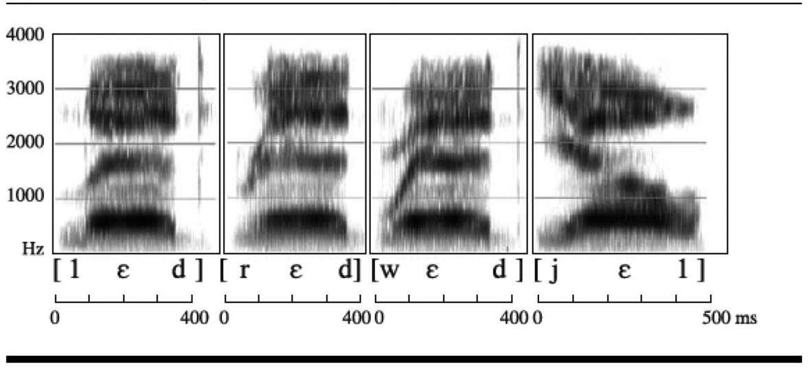 最后要考察的英语辅音是边、央近音[l,r,w,j]。图8.11是 led , red , wed , yell 等词的语图,边、央近音就在其中。所有这些浊近音的共振峰跟元音共振峰几乎一样。在第一个词的词首边音中,三个共振峰中心频率约为250、1100、2400 Hz(强度很低),但到元音开始处音强突变。正像我们上面注意到的,共振峰模式的显著变化是浊鼻音和边音的特点。但在词末,这种显著变化可能要少一些,如图8.11的 yell 。发词末边音时由于舌尖跟龈接触面可能很小或者根本没有接触,所以所发的音并非一个真正的边音,而是一个后、不圆唇元音。共振峰频率为1100 Hz或1200 Hz左右,这是大多数人发词首边音的典型模式。