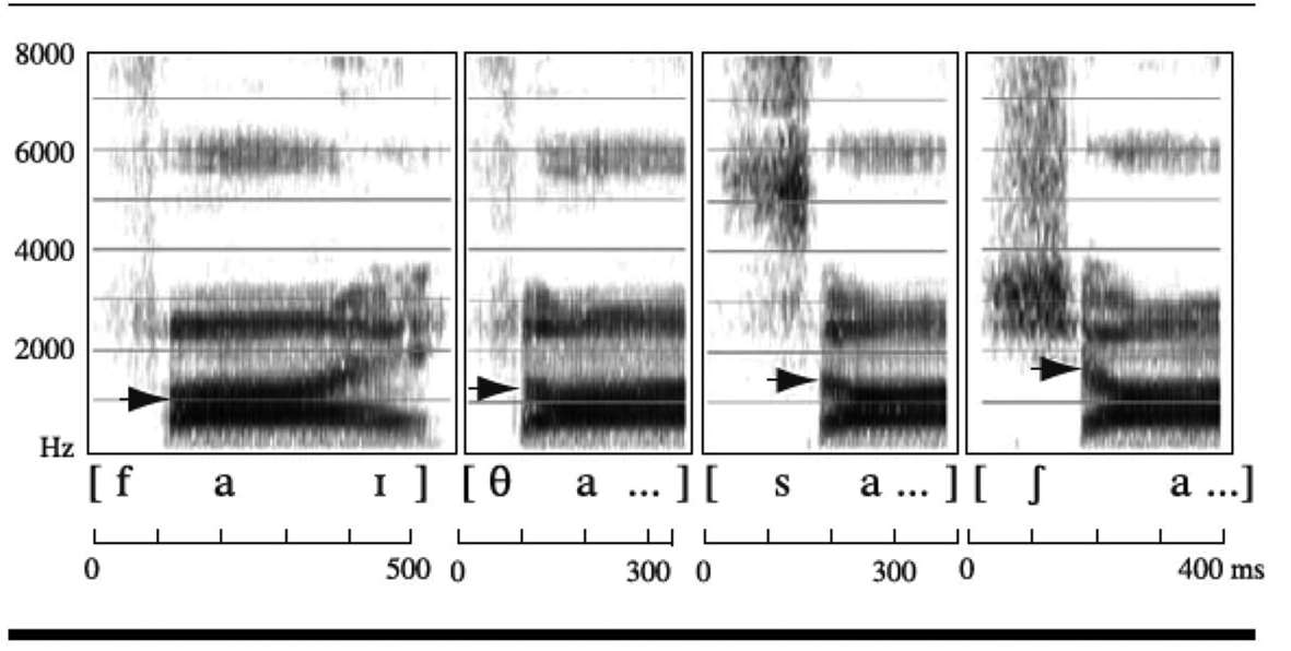 所有这些音都拥有频率分布范围很宽的随机能量。[f]和[θ]的模式几乎一样。区分这两个词的是移向后接元音的第二共振峰变化,图中用箭头表示。[f]中第二共振峰变化非常小,而[θ]在大约1200 Hz处开始下降。由于这两个音之间的差别非常小,所以在噪音背景下它们常常混淆在一起,而且在一些英语地方口音中它们被归为一个音。比如伦敦东区考克尼腔中,就不区分 fin 和 thin 。