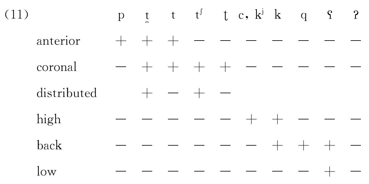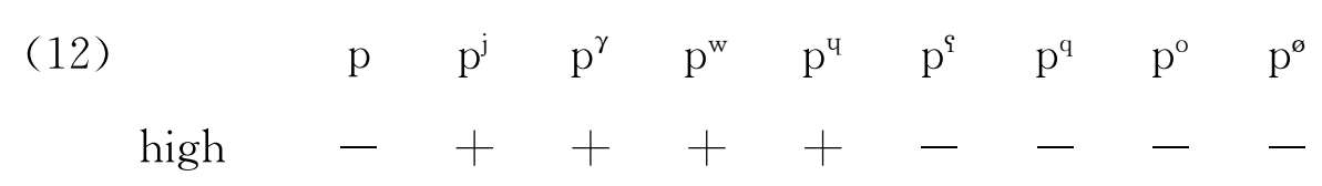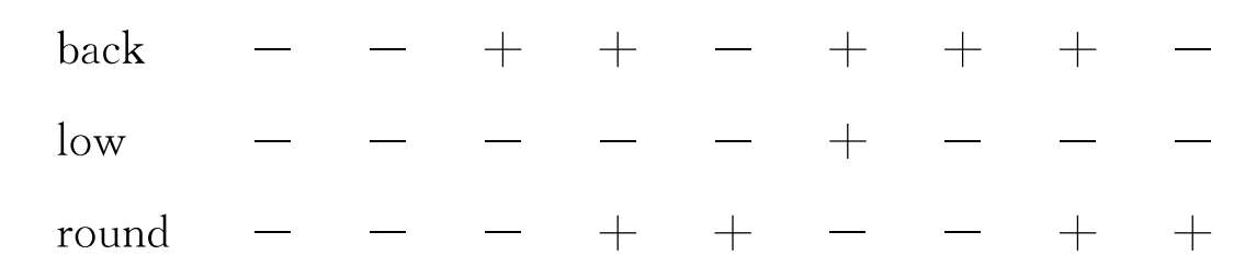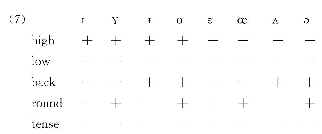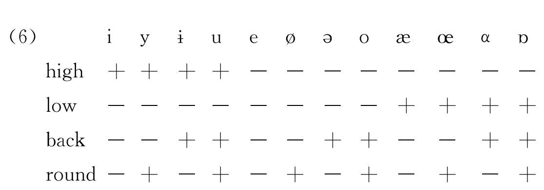 上面所引例子非常简单。一般来说,音系部分的规则不但会对底层的“+”和“-”值有较好的规定,而且也会极大地改变特征值,并且可能还会插入、删除或重组音段。比如说,构成要素“by”被表征为包含两列的底层矩阵,其中的第二列被规定为高元音、前元音(用特征值进行规定)。然而,相应的语音矩阵将包含三列,第二列被规定为低元音、后元音,第三列为上颚滑音(这里的规定要求在语音矩阵中用整数值的条目表示) [1] 。
