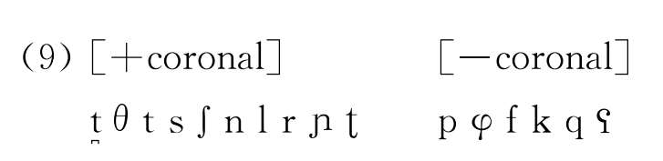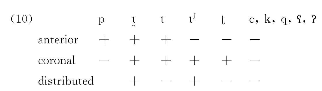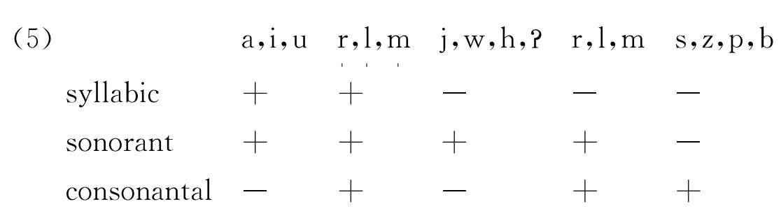 范畴特征包括语音系统的普遍特征与附加特征(diacritic feature),附加特征实质上指明的是规则的例外情况。在一些方言中“what”所对应的语音表达式为[wat],所以,对应于“what”的矩阵包含三个音段,第一个规定为唇滑音(labial glide),第二个规定为低元音、后元音与非圆唇元音,第三个是清辅音、齿辅音与塞辅音(这些规定完全用普遍语音系统提供的特征值“+”和“-”表示)。在这种情况,音系部分的规则会将这些用“+”和“-”值表示的规定转化为用整数表示的更加详细的规定,即每个音段的语音特征(如舌位的高度、送气的程度等),它所显示的值达到预设的普遍语音理论所要求的精确程度,并在语言所准许的变异范围之内。在这个例子中,被指派的值将把(5)中“what”的底层矩阵中的分歧简单地修正为“+”和“-”值。