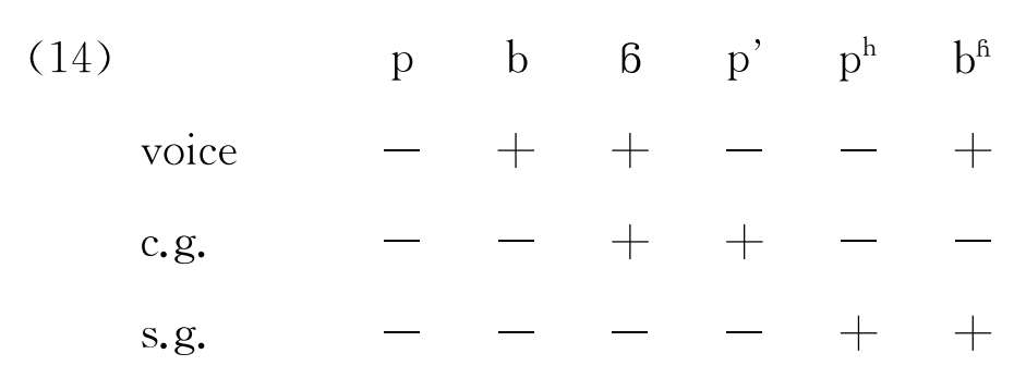 Voiced sounds are[+voice].The feature[spread glottis]describes aspirated obstruents([p