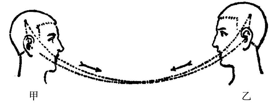 循环的出发点是在对话者之一例如甲的脑子里,在这里,被称为概念的意识事实是跟用来表达它们的语言符号的表象或音响形象联结在一起的。假设某一个概念在脑子里引起一个相应的音响形象,这完全是一个 心理 现象。接着是一个 生理 过程:脑子把一个与那音响形象有相互关系的冲动传递给发音器官,然后把声波从甲的口里播送到乙的耳朵:这是纯粹的 物理 过程。随后,循环在乙方以相反的程序继续着:从耳朵到脑子,这是音响形象在生理上的传递;在脑子里,是这形象和相应的概念在心理上的联结。如果轮到乙方说话,这新的行为就继续下去——从他的脑子到甲方的脑子——进程跟前一个完全相同,连续经过同一些阶段,可以图示如下: