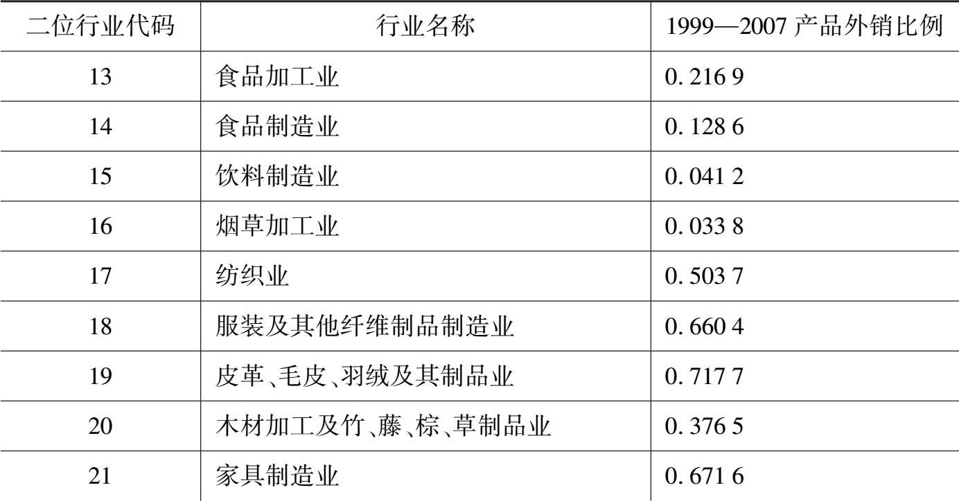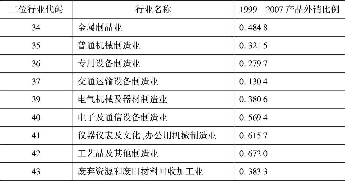 本文根据企业的行业代码对企业数据按照行业进行分类汇总,得到FDI流入的行业数据。行业差异主要源于中国引进FDI相关的政策激励,尤其是在投资导向方面的政策。比如《外商投资产业指导目录》中就13大行业进行了详细分类,包括鼓励类、限制类和禁止类的外商投资产业。由表2中的数据可以观察到,文教体育用品制造业,皮革、毛皮、羽绒及其制品业,工艺品及其他制造业,家具制造业,服装及其他纤维制品制造业的外销比例,显著高于烟草加工业,饮料制造业,黑色金属冶炼及压延加工业等行业。不同行业的产品外销比例具有显著差异,因此,需要用计量模型先确定不同行业的FDI流入类型,然后再做进一步的实证分析。