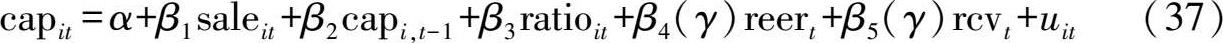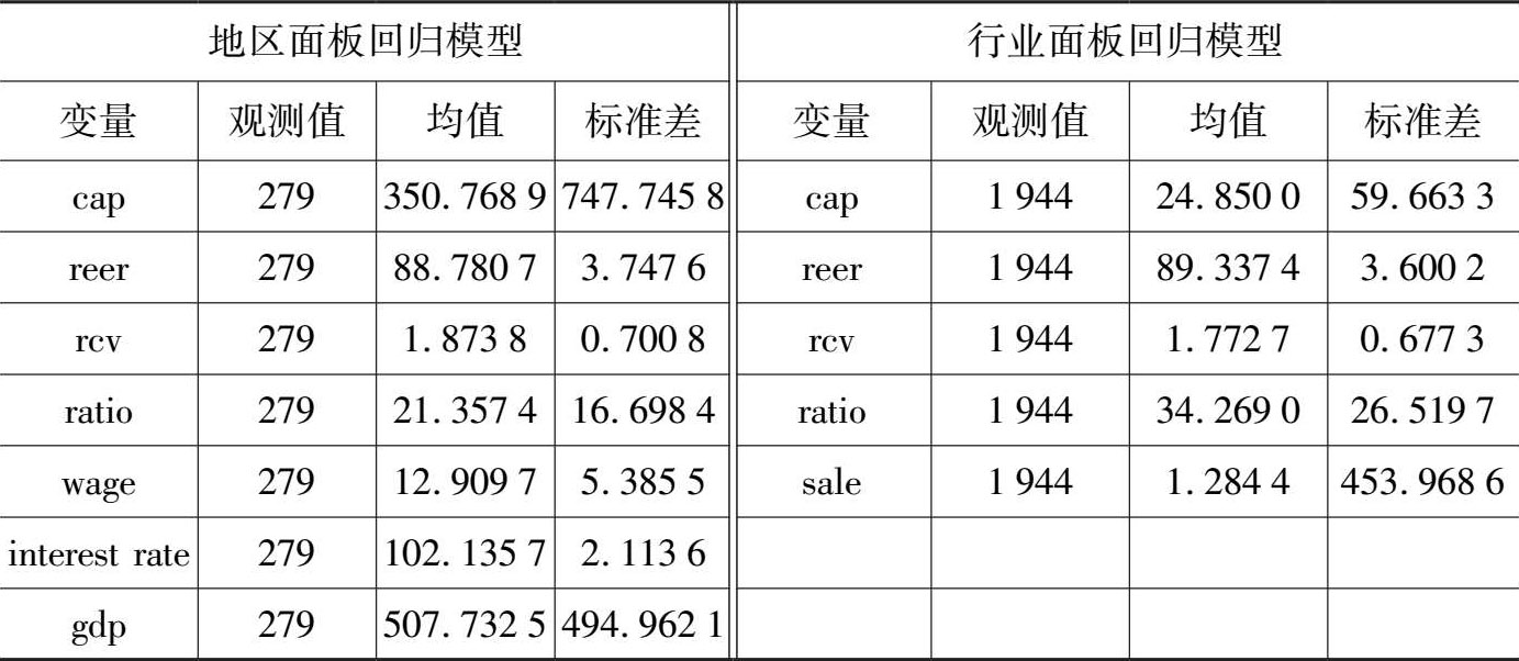 其中 i 表示不同的4位代码行业, t 表示不同的年份,cap it 表示行业 i 在 t 年的外资或港澳台FDI流入, β i 表示参数。sale it 表示行业 i 在 t 年的产品销售额,cap i , t -1 表示行业 i 的滞后一期的FDI流入,ratio it 表示 i 行业 t 年的产品外销比例,reer t 表示 t 年的实际有效汇率,rcv t 表示 t 年的汇率波动水平。