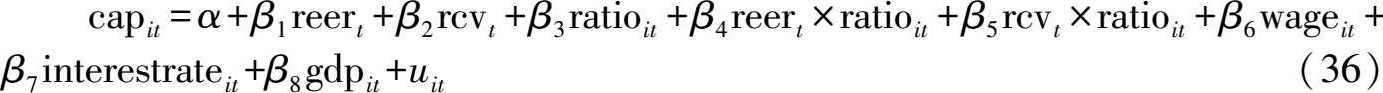 其中 i 表示不同的省、直辖市和自治区( i =1,…,31), t 表示不同的年份,cap it 表示地区 i 在 t 年的外资或港澳台FDI流入, β 表示参数。reer t 表示 t 年的人民币实际有效汇率。rcv t 表示 t 年的人民币实际有效汇率的波动程度。ratio it 表示 t 年 i 地区企业的产品外销比例。reer t ×ratio it 与rcv t ×ratio it 分别为汇率水平和汇率波动程度与产品外销比例的交乘项。wage it 为 i 地区 t 年的工资水平。interestrate it 为 i 地区 t 年的利率水平。gdp it 为 i 地区 t 年的国内生产总值。分样本的计量模型回归方程与式(36)相同,我们分别用三个模型进行分析,比较汇率对不同类型的FDI流入的影响。
