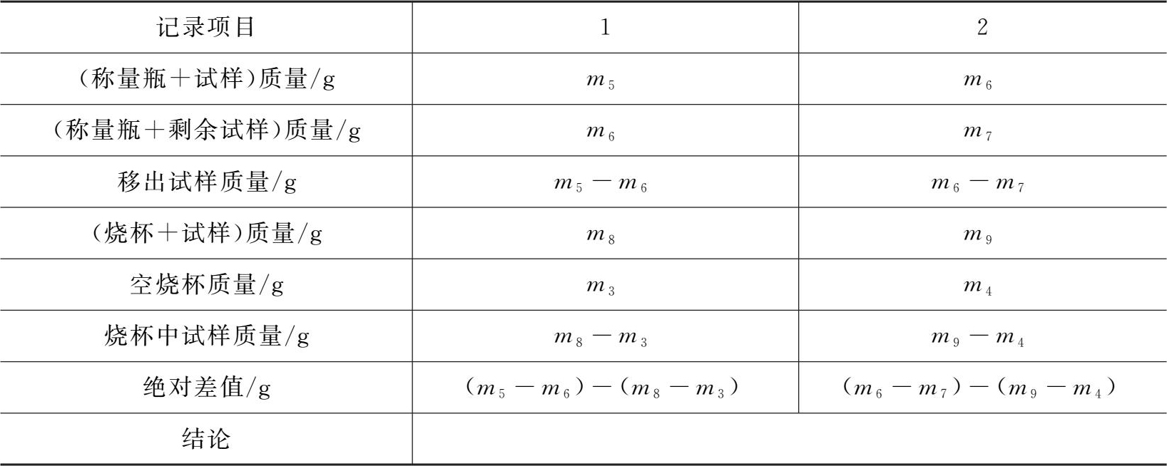 分别准确称量1号和2号小烧杯加入试样后的质量 m 8 、 m 9 ,则1号小烧杯中试样的质量为( m 8 - m 3 ),2号小烧杯中试样的质量为( m 9 - m 4 ),要求从称量瓶中转移的试样质量与转移至小烧杯中的试样质量之间的绝对差值≤±0.4mg,即( m 5 - m 6 )与( m 8 - m 3 )的质量差≤±0.4mg,( m 6 - m 7 )与( m 9 - m 4 )的质量差≤±0.4mg。若大于此值,实验不合要求。