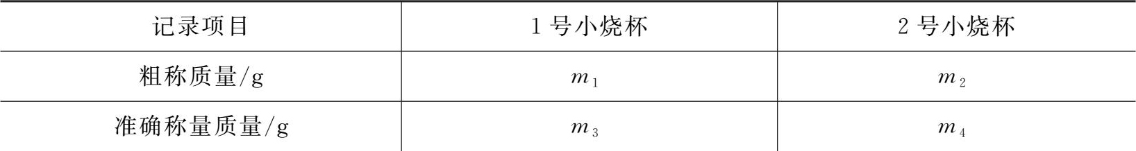 取两只洁净、干燥、并编号的50mL小烧杯,用托盘天平或0.01g电子天平分别粗称其质量,并采用有效数字记录质量 m 1 、 m 2 。然后在0.1mg电光天平或电子天平上精确称量,要求准确至±0.1mg,分别记录其质量 m 3 、 m 4 ,比较 m 1 和 m 3 、 m 2 和 m 4 的差别,明确有效数字在记录实验数据中的重要性。