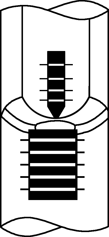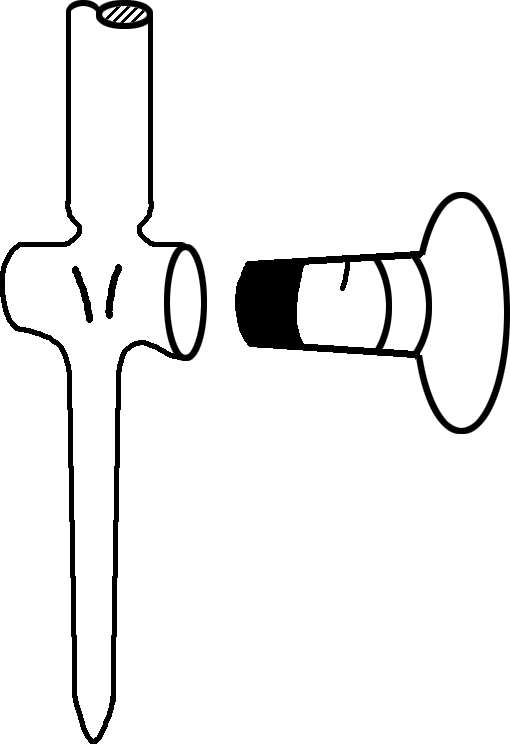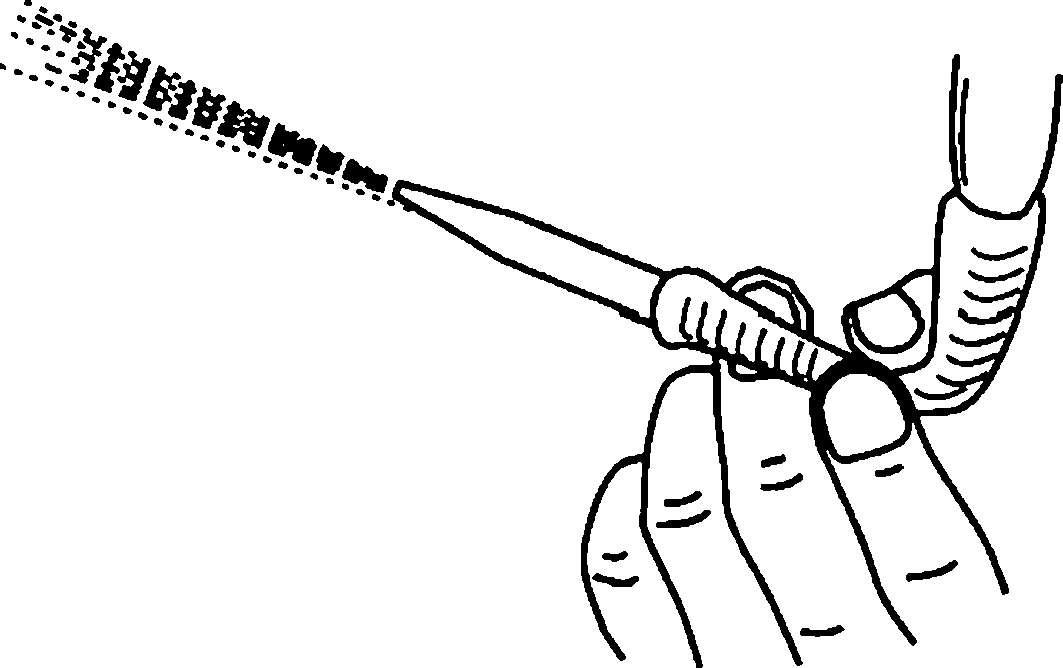 擦干活塞和活塞槽内壁,用手指蘸少量凡士林在活塞的两端涂上薄薄一层,注意在活塞孔的附近不能涂多,以免堵塞活塞孔(图2-12)。涂完以后将活塞插入槽内,活塞孔应与滴定管平行(图2-13)。向同一方向转动活塞,直至活塞中油膜均匀透明,若发现仍转动不灵活,或活塞内的油层出现纹路,表示涂油不够。如果有油从活塞缝隙溢出或挤入活塞孔,表示涂油太多。遇到这些情况,都必须将活塞和活塞槽擦干净后重新涂油。