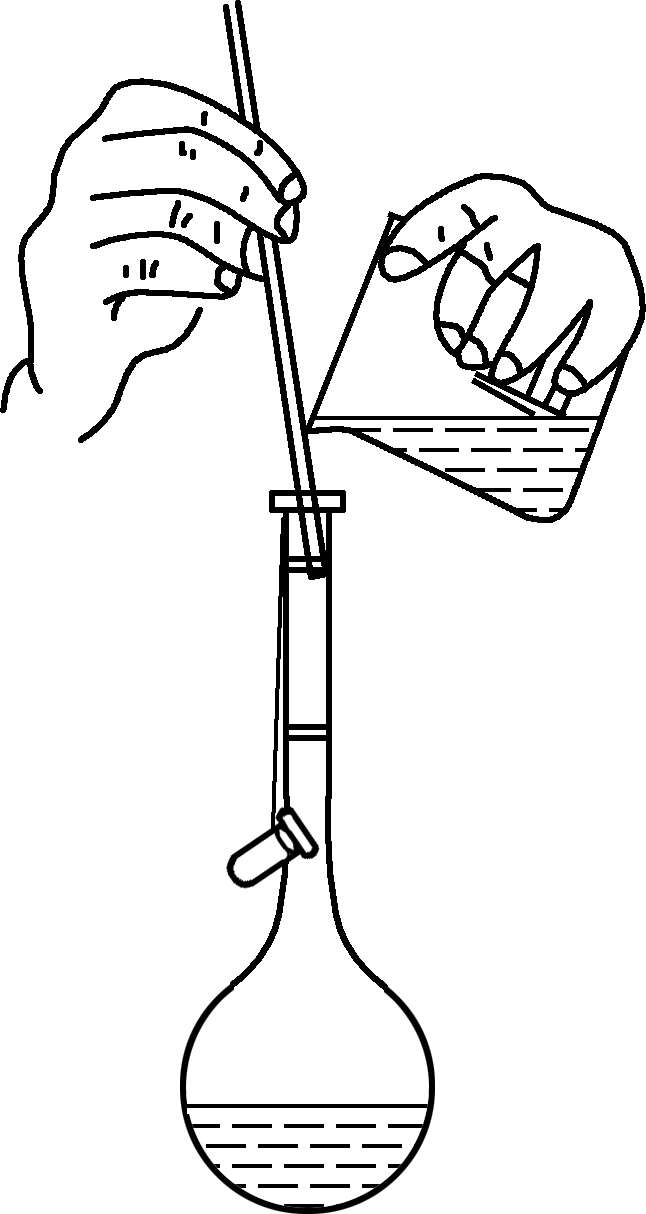 在配制标准溶液前,应先将准确称量的固体试样在烧杯中溶解后转移到容量瓶中(图2-11),并用蒸馏水多次洗涤烧杯和玻棒,将洗涤液也转移入容量瓶中,以保证溶质全部转移。缓慢地加入蒸馏水,加到接近标线1 cm处。等待1~2min,使附在瓶颈上的水流下。然后用洗瓶或滴管加入蒸馏水至标线(小心操作,勿过标线)。加水时,视线平视标线,直至溶液的弯月面与容量瓶的标线正好相切,盖好瓶塞。将容量瓶倒转,等气泡上升后,轻轻振荡。再倒转过来。重复操作多次,就能使容量瓶中溶液混合均匀。