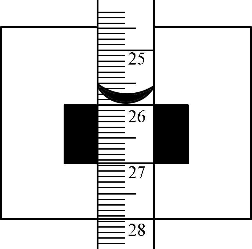 读数时滴定管必须保持垂直状态。注入或放出溶液后稍等1~2min,待附着于内壁的溶液流下后再开始读数。常量滴定管读数应读至小数点后第二位,如22.62mL、20.20mL等。读数时视线必须与液面保持在同一水平面。对于无色或浅色溶液,读它们的弯月面下缘最低点的刻度;对于深色溶液如高锰酸钾、碘水等,可读液面两侧最高点的刻度。为了帮助准确读出弯月面下缘的刻度可在滴定管后面衬一张“读数卡”。所谓“读数卡”就是一张黑纸或深色纸(约3cm×1.5cm)。读数时将它放在滴定管背后,使黑色边缘在弯月面下方约1mm左右,此时看到的弯月面反射层呈黑色(图2-15),读出黑色弯月面下缘最低点的刻度即可。若滴定管的背后有一条蓝线(或蓝带),无色溶液这时就形成了两个弯月面,并且相交于蓝线的中线上(图2-16),读数时读此交点的刻度;若为深色溶液,则读液面两侧最高点的刻度。
