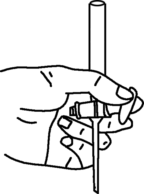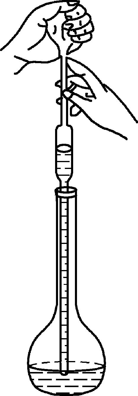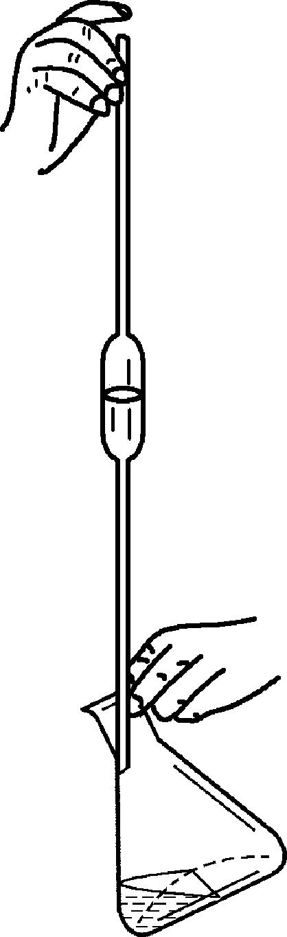 移液管(或吸量管)在使用前,依次用洗液、自来水、蒸馏水洗至内壁不挂水珠为止。最后用少量被量取的液体润洗三遍。吸取液体时,左手拿洗耳球,右手拇指及中指拿住移液管(或吸量管)的上端标线以上部位,使管下端伸入液面下约1cm,不应伸入太深,以免外壁沾有过多液体。也不应伸入太浅,以免液面下降时吸入空气。左手用洗耳球轻轻吸取液体,眼睛注意观察管中液面上升情况,移液管(或吸量管)则随容器中液体下降而向下移(图 2-8)。当液体上升到标线以上时,迅速用食指按住管口。将移液管(或吸量管)从液体内取出,靠在容器壁上,然后稍微放松食指,同时轻轻转动移液管(或吸量管),使标线以上的液体流回去。当液面的弯月面最低点与标线相切时,就按紧管口,使液体不再流出。取出移液管(或吸量管)移入接受容器中,仍使其出口尖端接触器壁,让接受容器倾斜而移液管保持直立。抬起食指,使液体自由地顺壁流下(图2-9)。待液体全部流尽后,约等15s,取出移液管(或吸量管)。