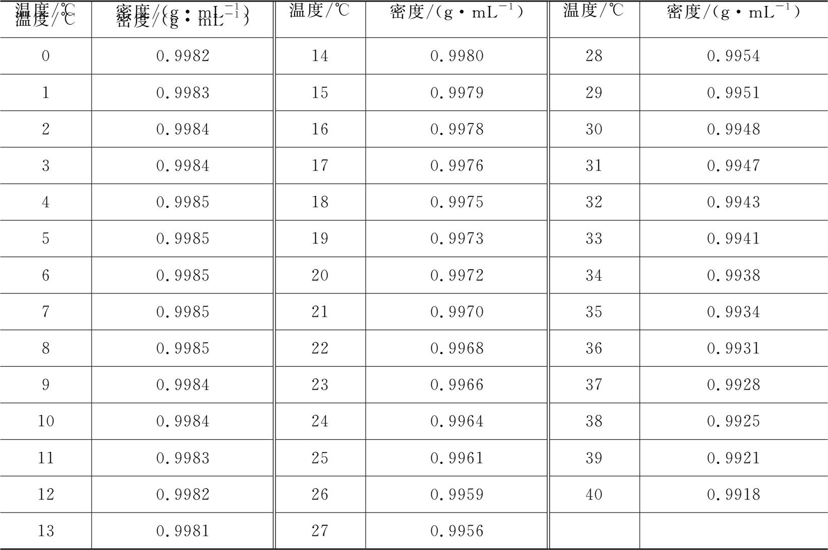 滴定管、容量瓶、移液管的实际容积往往采用称量校准方法。原理为:称取量器中所放出或所容纳H 2 O的质量,并根据该温度下H 2 O的密度,计算出该量器在20℃(玻璃量器的标准温度)时的容积。但是,由质量换算成容积时必须考虑H 2 O的密度、空气浮力、玻璃的膨胀系数三个方面的影响,为了方便计算,将上述三种因素综合考虑,得到一个总校准值。经总校准后的纯水密度列于表2-4。