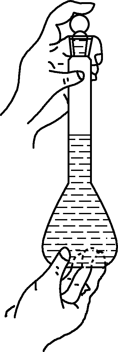 在配制标准溶液或将溶液稀释至一定浓度时,我们往往要使用容量瓶。容量瓶是平底、细颈梨型瓶,瓶口带有磨口玻璃塞或塑料塞。颈上有环型标线,瓶体标有体积,一般表示20℃时液体充满至刻度时的容积。常见的有10mL、25mL、50mL、100mL、250mL、500mL和1000mL等各种规格,此外还有1mL、2mL、5mL的小容量瓶。容量瓶在洗涤前应先检查一下瓶塞是否漏水。容量瓶检漏方法:容量瓶中放入自来水,放到标线附近,塞好瓶塞后,左手按住瓶塞,右手把持住瓶底边缘(图2-10),将容量瓶倒立片刻,观察瓶塞有无漏水现象。不漏水的容量瓶才能使用。按常规操作把容量瓶洗净。为避免打破瓶塞,应该用一根线绳把瓶塞系在瓶颈上。
