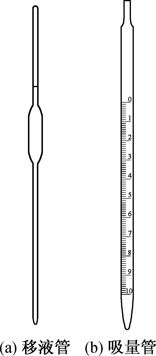 移液管和吸量管是用来准确移取一定体积液体的量器(见图2-7),准确度与滴定管相当。移液管中部具有“胖肚”结构,无分刻度,两端细长,只有环行标线,“胖肚”上标有指定温度下的容积。常见的规格为5 mL、10mL、25mL、50mL和100mL等;在使液体自然放出时,最后因毛细作用总有一滴液体留在管口不能流出。这时不必用外力使之流出,因为校正移液管的容积时,就没有考虑这一滴液体。放出该液体时把移液管的尖嘴靠在容器壁上,稍停片刻就可拿开。也有少数移液管,上面标有“吹”字,则放出液体时就要把管口的液体吹出。吸量管是有分刻度的直型玻璃管(见图2-7),管的上端标有指定温度下的总容积。吸量管的容积有1 mL、2 mL、5 mL和10mL等,可用来吸取不同容积的液体,一般只量取小体积的液体,其准确度比“胖肚”移液管稍差。量取液体时每次都是从上端0.00刻度开始,放至所需要的体积刻度为止。管上标有“吹”“快”等字样,在使用它的全量程时,应将管尖残留的液滴立即吹入接受容器中并移开吸量管。