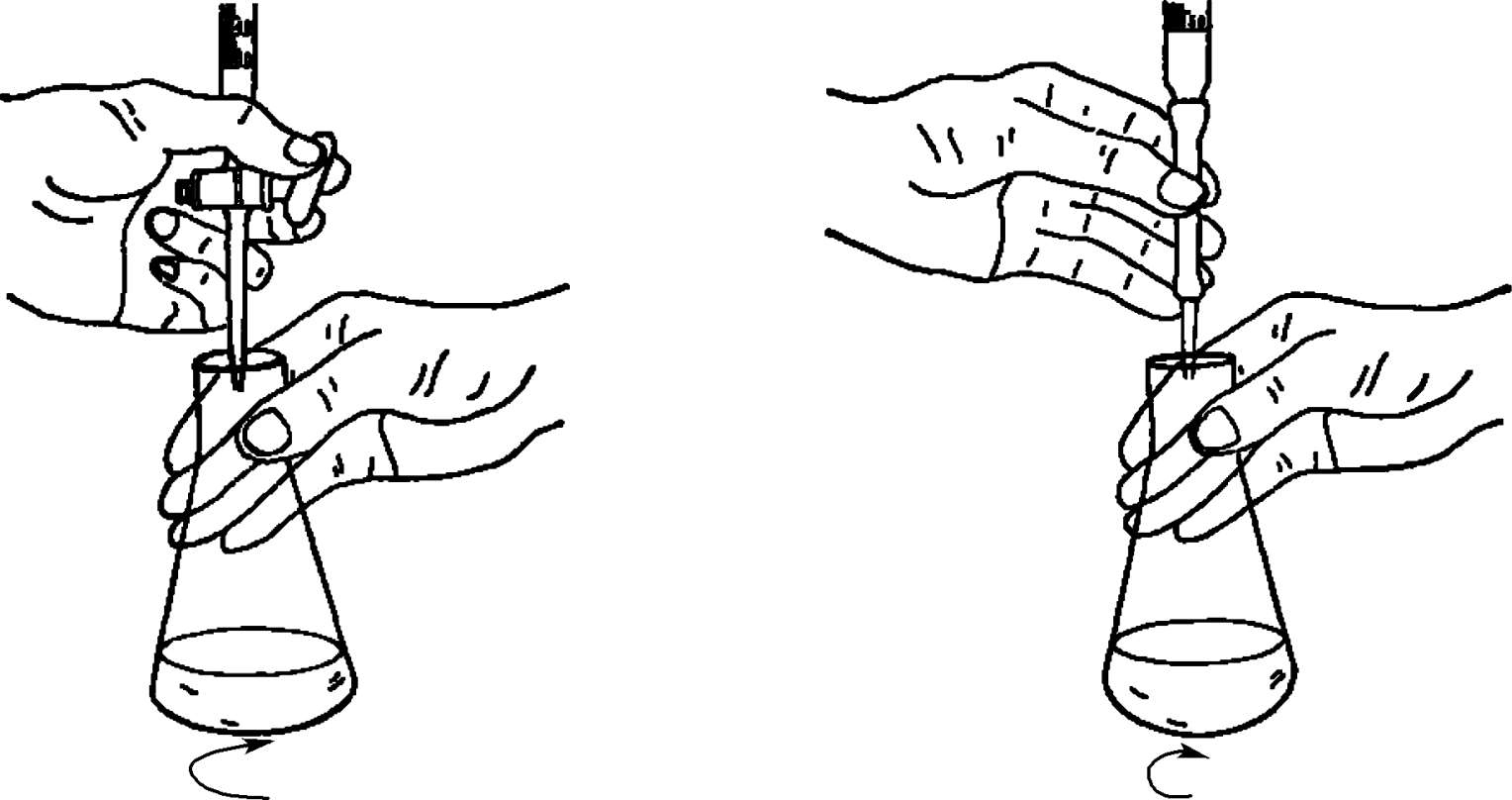 将滴定管夹在滴定管夹上,酸式滴定管的活塞柄向右,滴定管保持垂直。在排出出口管中的气泡、调整好液面高度、并记录初读数之后,还要将挂在出口管尖处的残余液滴除去后才能开始滴定。将滴定管伸入烧杯或锥形瓶内,左手食指和中指从滴定管后方向右伸出,拇指在前方与食指及中指操纵活塞(图2-17),使液滴逐滴加入。如果在烧杯内滴定,则右手持玻璃棒不断轻轻搅动溶液;如果在锥形瓶内滴定,则右手持瓶颈不断摇动,应向同一方向作圆周旋转,而不能前后振动,否则溶液会溅出(图2-18)。每次滴定时最好都是将溶液装至滴定管的“0.00”毫升刻度或稍下一点,这样可以消除因滴定管上下刻度不均匀所引起的误差。滴定时速度的控制一般为开始时每秒3~4滴;接近终点时,应一滴一滴加入,并不停地摇动,仔细观察溶液的颜色变化;也可每次加半滴,加半滴时使溶液悬而不滴,让其沿器壁流入容器,再用少量去离子水冲洗内壁,并摇匀,仔细观察溶液的颜色变化,直至滴定终点为止,读取终读数,立即记录。注意:在滴定过程中左手不应离开滴定管,以防流速失控。实验结束后,倒出溶液,用自来水、蒸馏水顺序洗涤滴定管,将滴定管倒置,或装满蒸馏水,罩上滴定管盖,以备下次使用。