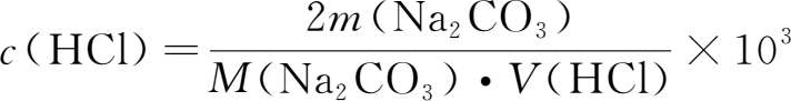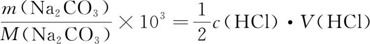 式中: c (HCl)为盐酸浓度,mol·L -1 ; m (Na 2 CO 3 )为Na 2 CO 3 质量,g; M (Na 2 CO 3 )为Na 2 CO 3 摩尔质量,g·mol -1 ; V (HCl)为滴定消耗盐酸体积,mL。