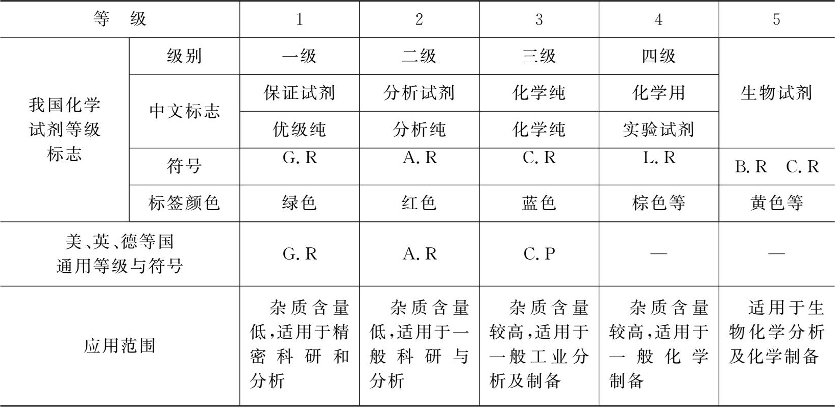 化学试剂的规格是以其中所含杂质的多少来划分的,一般分为四个等级,我国化学试剂的规格与标志及某些国家化学试剂相应的规格与标志见表1-1。