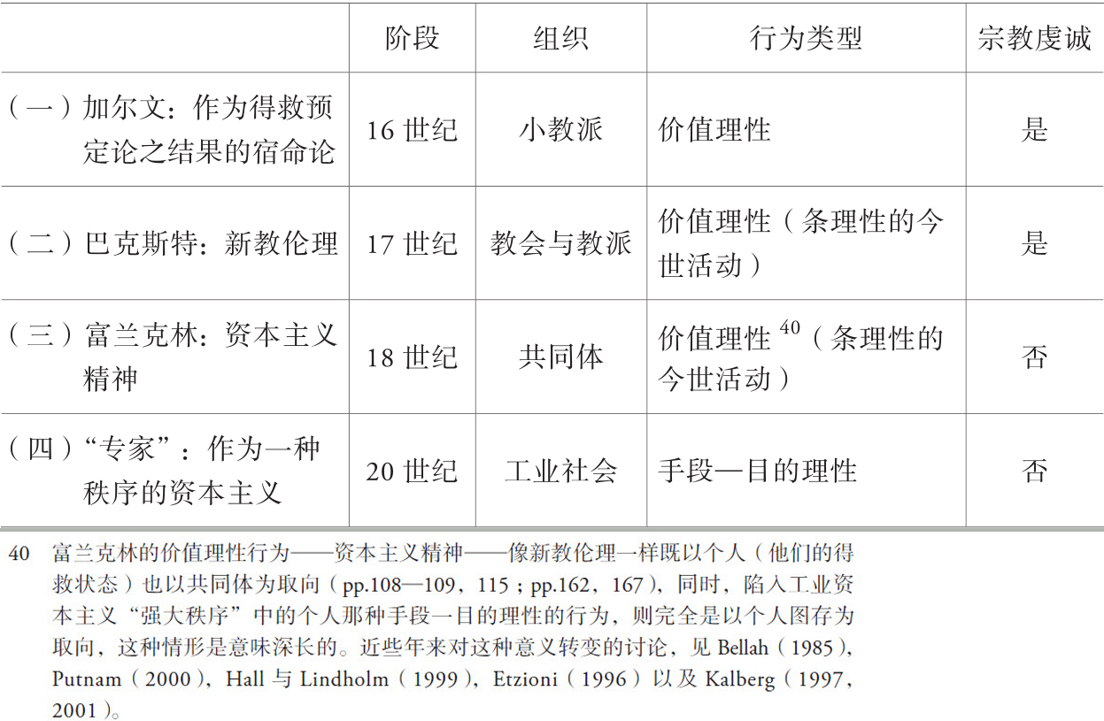 尽管《新教伦理》常常被理解为是给现代资本主义的崛起,甚至给我们今天世俗的城市工业化世界提供了一种解释,但它的目的实际上却谦逊得多。韦伯希望证明的是,要在“今世的”功利主义关切与商业精明的范畴以外,才能寻找到现代职业伦理和追求物质成就的一个重要源泉,即我们所说的“资本主义精神”。哪怕是人类的贪得无厌、进化论的进步过程或者英雄式资本家的经济利益,也不可能说明它的起源。毋宁说,韦伯认为,这种精神在很大程度上乃是产生于16、17世纪清教教会与教派的“新教伦理”,即加尔文主义信徒(今天以长老会教友闻名)、循道宗信徒、公理会信徒、虔信派信徒、贵格会信徒、独立派和门诺教信徒的“新教伦理”。这些真挚的信徒都会毕生坚持劳动并追求物质成就,其他一切在他们看来都无关紧要,甚至家庭、友情、闲睱或消遣也是如此。韦伯坚持认为,只要是讨论资本主义精神的起源,就必须认识到这一核心宗教源头。