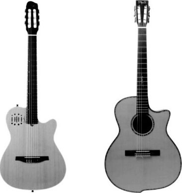 近几年来,有很多爵士吉他演奏家和流行音乐吉他手也经常用到古典吉他,但是都做了适当的调整,这种吉他我们一般称它为电箱尼龙吉他或者现代尼龙吉他。下图最左边的是传统的古典吉他,右边两把吉他是现代版尼龙吉他。