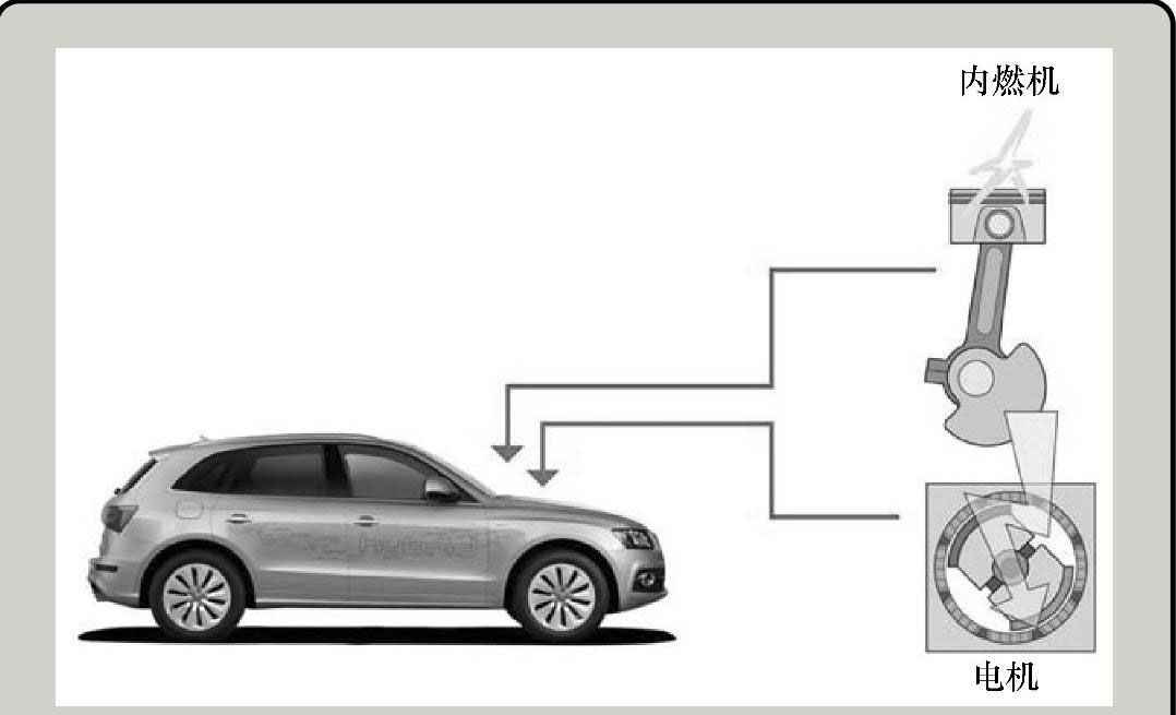(2)驱动混合动力技术 驱动混合动力技术是指将两种不同的动力装置组合在一起使用,且这两种动力装置的工作原理是不同的。目前,混合动力技术是指将内燃机与电动机组合在一起的形式(图1-9)。该技术可用作发电机从动能中回收电能(能量回收)、用作发动机来驱动车辆、用作内燃机的起动机。