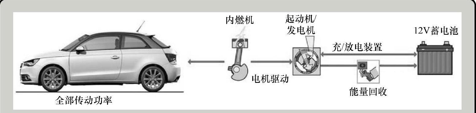 (3)微混合动力驱动 使用这种驱动结构,电动部件(起动机/发电机)只是用来执行起动-停止功能的。一部分动能在制动时又可作为电能使用(能量回收),其工作示意如图1-11所示。不能以纯电动方式驱动车辆来行驶。12V蓄电池的特性针对频繁起动发动机这个特点进行匹配。应用于很多奥迪车型上,如在Audi A1上就有所使用。