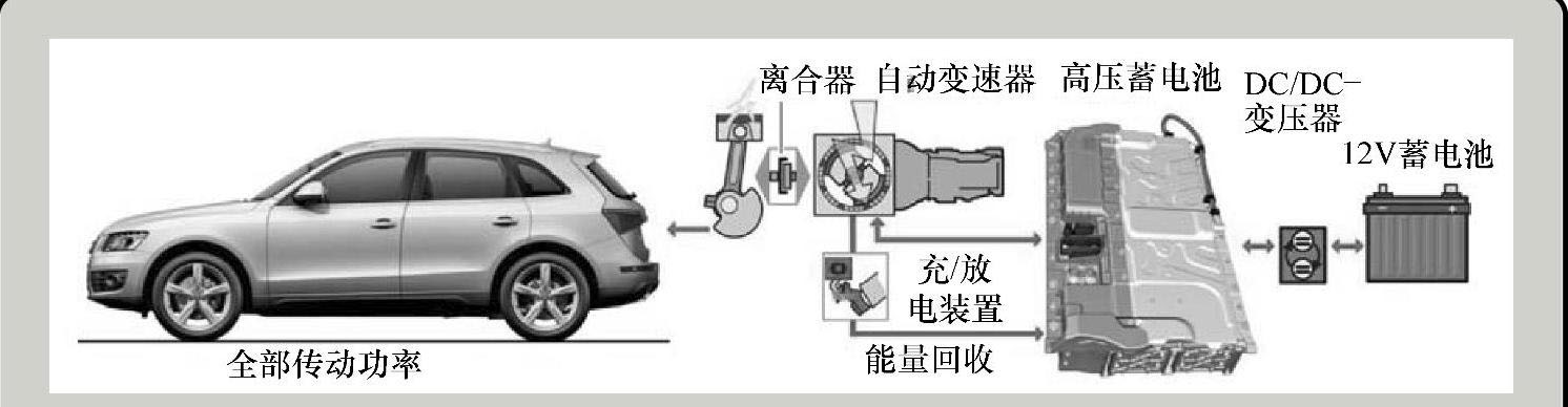 (2)中混合动力驱动 中混合动力驱动在技术上和部件方面都与完全混合动力驱动是一样的,只是它不能以纯电动方式驱动车辆来行驶。它也有能量回收、起动-停止和助力(Boost)功能。