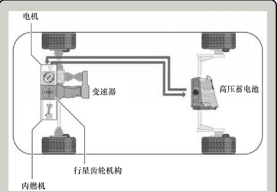 (2)分支式混合动力系统 分支式混合动力系统除了有内燃机外,还有一个电机,两者都安装在前桥上。内燃机和电机所发出的动力经一个行星齿轮机构到达汽车变速器,其结构如图1-13所示。但与并联式混合动力系统不同的是,本系统不能将内燃机和电机各自的功率加起来传递到车轮上。所产生的功率,一部分用于驱动车辆,另一部分作为电能存储在高压蓄电池内。