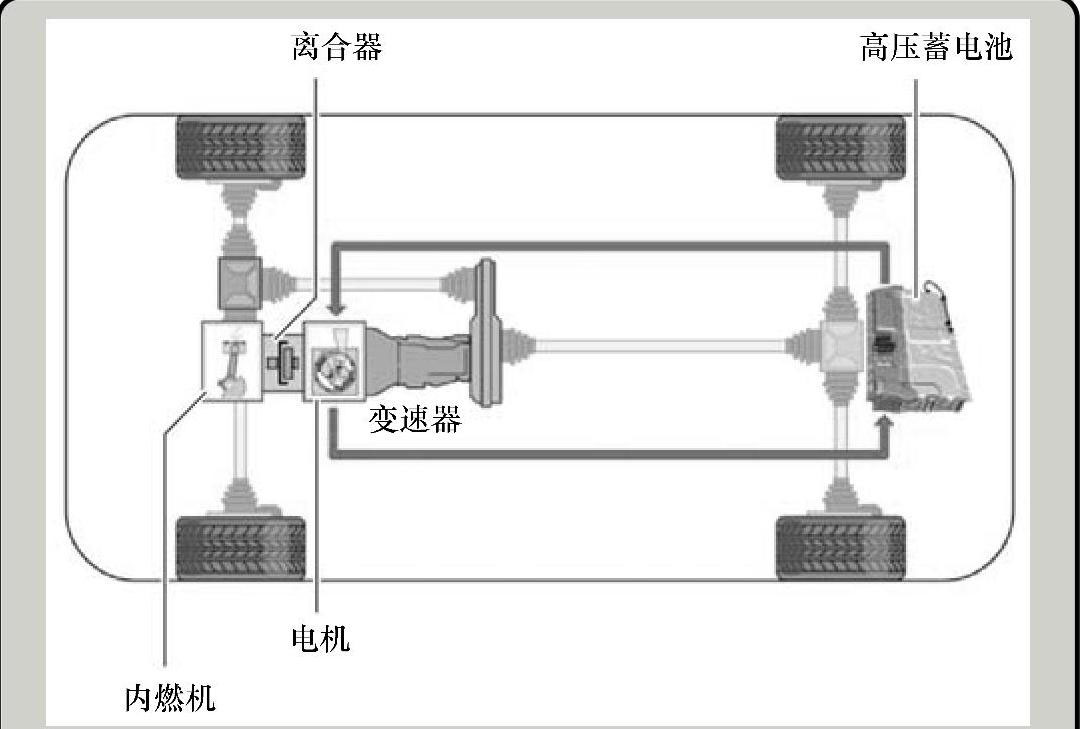 (1)并联式混合动力系统 并联式结构的特点是简单。如果要对现有车辆进行“混合动力改造”,就使用这种结构。内燃机、电机和变速器装在同一根轴上,其结构如图1-12所示。内燃机和电机各自的功率加起来,就是总功率。这种机构设计可以充分利用原车上的件(就是很多件可直接拿来用)。对于四轮驱动车辆,并联式混合动力结构可以将动力分配到4个车轮上。