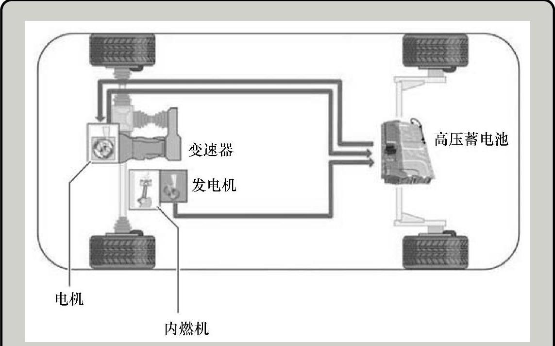 (3)串联式混合动力系统 车辆只通过电机来驱动,内燃机与驱动轴是没有机械连接的。内燃机带动一个发电机,该发电机在车辆行驶时为电动机供电或者给高压蓄电池充电,其结构如图1-14所示。