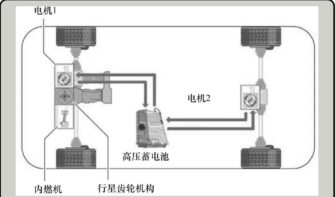 (4)分支式串联混合动力系统 分支式串联混合动力系统就是把分支式混合动力系统和串联混合动力系统综合在一起。该系统有一个内燃机和两个电机。内燃机和电机1装在前桥上,电机2装在后桥上。这种结构用于四轮驱动车。内燃机和电机1可以通过行星齿轮机构来驱动车辆变速器。要注意的是:在这里也是不能就将内燃机和电机各自的功率加起来传递到车轮上。后桥上的电机2在需要时才会工作。高压蓄电池布置在前、后桥之间,其结构如图1-15所示。
