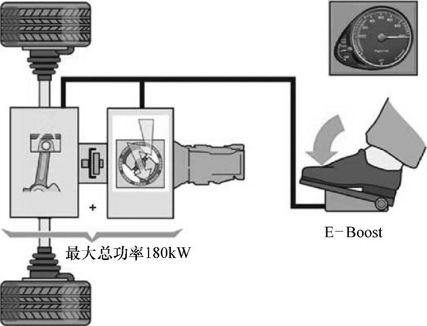 (5)电动加速(E-Boost) 混合动力驱动有一个电动加速功能,这与内燃机的强制降档功能(可提供最大发动机功率供使用)类似。如果执行了这个电动加速功能,那么电机和内燃机就会发出最大功率(合计总功率很大)。这两种驱动方式各自功率合在一起,就是传动系统的总功率。从技术上讲,电机(E-Maschine)内部是有功率损耗的,因此发电机输出功率要小于其驱动功率。