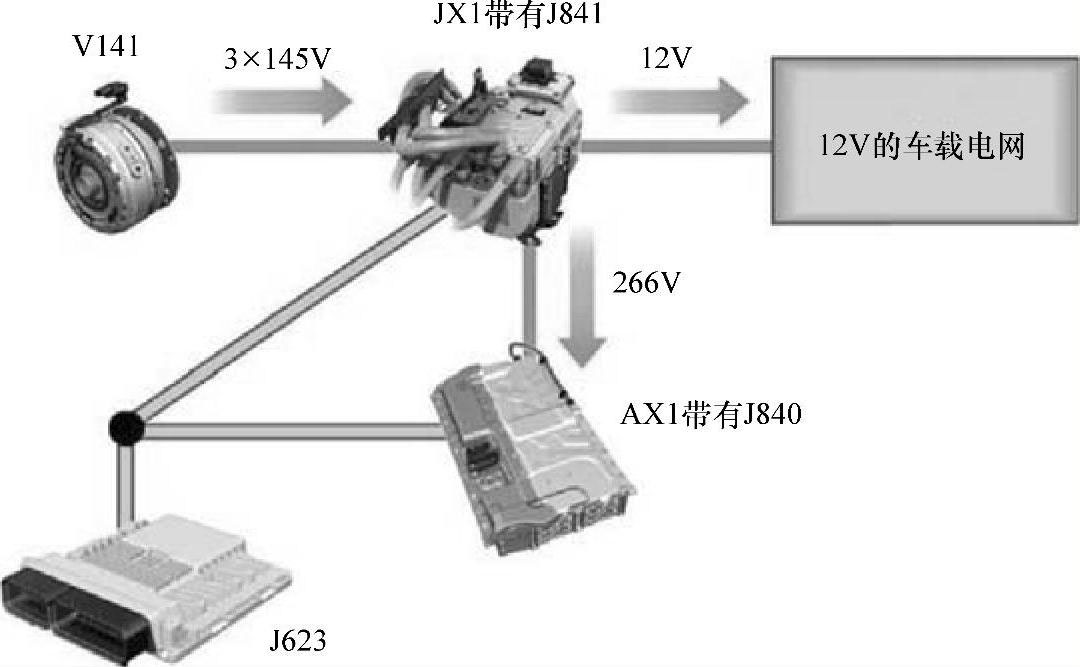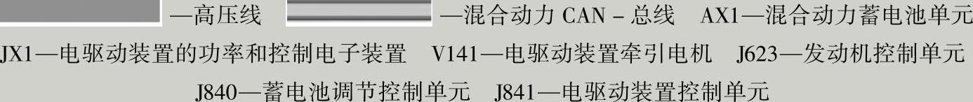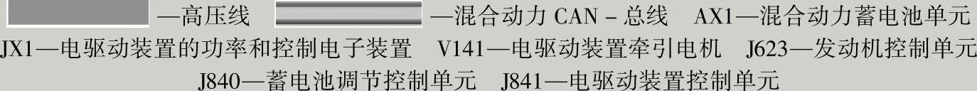 1)靠电能驱动来行车。高压蓄电池放电。在靠电能驱动行车时,由高压蓄电池供电。12V的车载电网由高压蓄电池供电,其工作示意如图1-16所示。