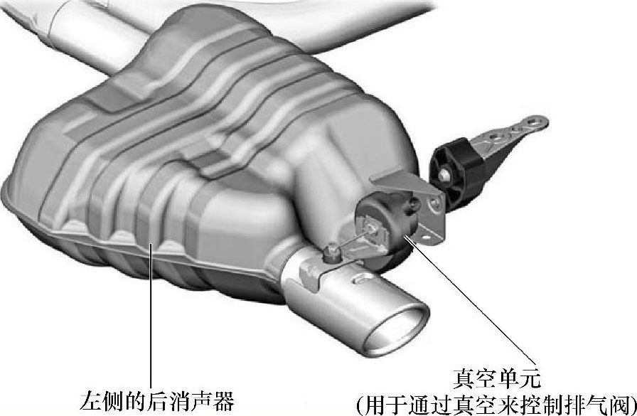 (3)可控式排气阀 在发动机排气系统的后消音器上采用可控式排气阀,只有左侧的后消音器上才装有这种可控式排气阀,该阀由排气控制阀1-N321来操控。接上真空,该阀就关闭;断开真空就打开。在发动机停机时,该阀是打开着的,在转矩不高于300N·m或者转速不超过1800r/min时以及怠速给蓄电池充电时,该阀是关闭着的(声响方面的原因),其结构如图1-20所示。