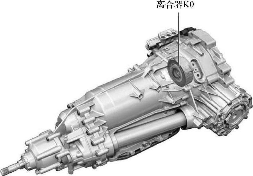 自动变速器控制单元J217是混合动力CAN总线和驱动CAN总线用户。多片式离合器(离合器K0)与电动机(E-Maschine)合成为一个模块,该模块取代了变矩器,安装在自动变速器的结构空间处(图1-22),并不显眼。这个多片式离合器浸在油池中工作,它用于将内燃机与电机(E-Maschine)的断开或连接。由于取消了变矩器,离合器K1就用作起步元件了。