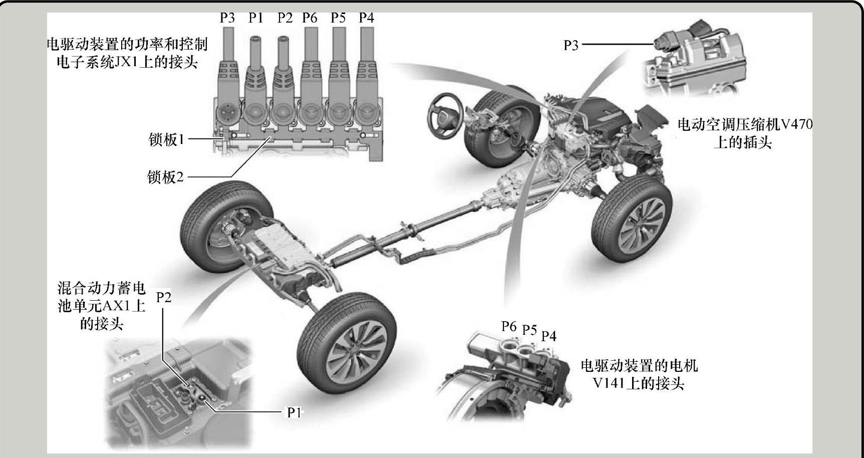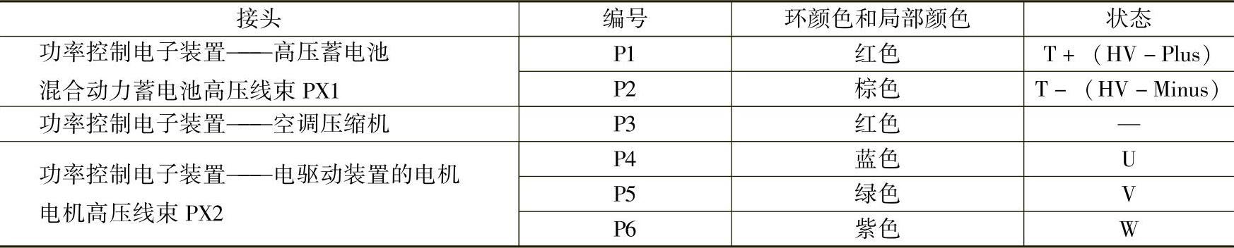 高压装置内有如下线路段:从高压蓄电池到功率控制电子装置的两根高压线(P1、P2);从功率控制电子装置到电驱动装置电动机的3根高压导线(P4、P5、P6);从功率控制电子装置到空调压缩机的一根双芯高压线(P3),高压装置的导线的分布情况如图1-30所示,高压装置的导线的相关参数见表1-1。