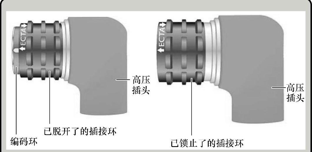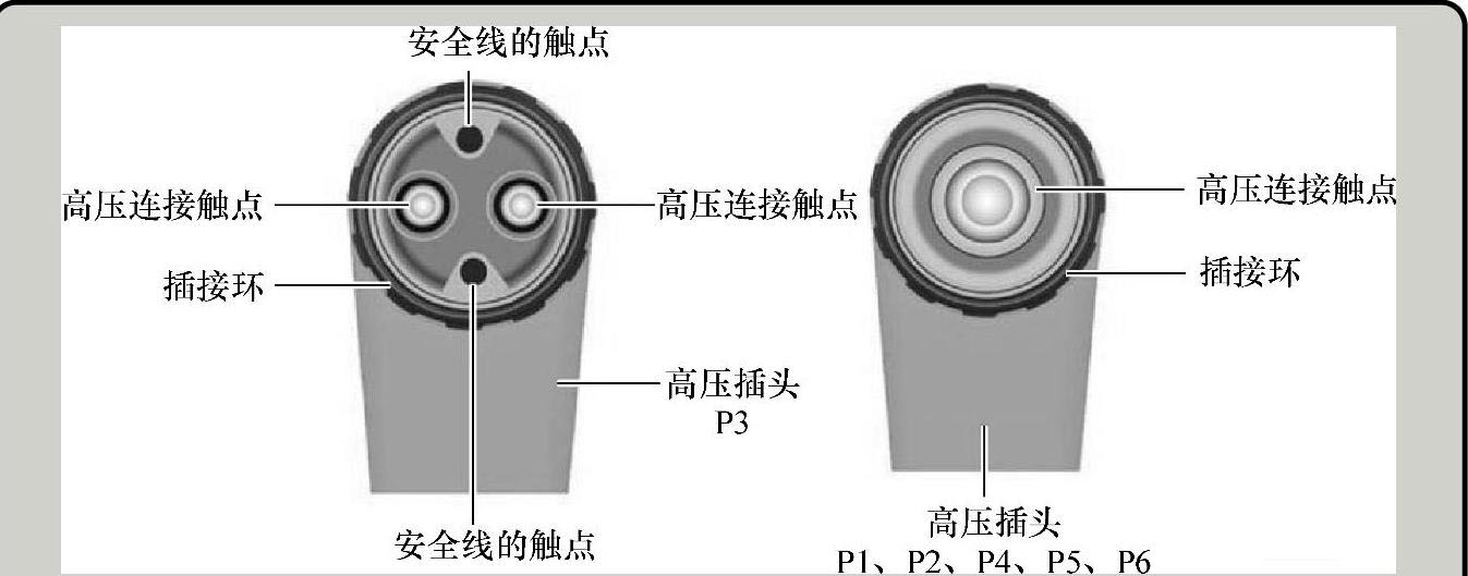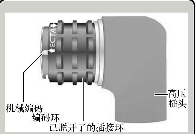 (2)高压插头 导线高压插头P3与其他导线插头是不同的,该插头是双芯的且有一个双圆形触点和两个用于安全线的触点,其区别如图1-31所示。在导线高压插头上有编码环,图1-31以高压插头P4为例来说明,如果向上拔出并松开插接环,就能看见环编码的颜色了。在插上了插头后,必须向下压插接环,直至其卡止,这样才算真正接好,如图1-32所示。除了通过颜色环来标出编码,高压插头和接口上还有机械编码。编码的位置用黄色标记标出,如图1-33所示。
