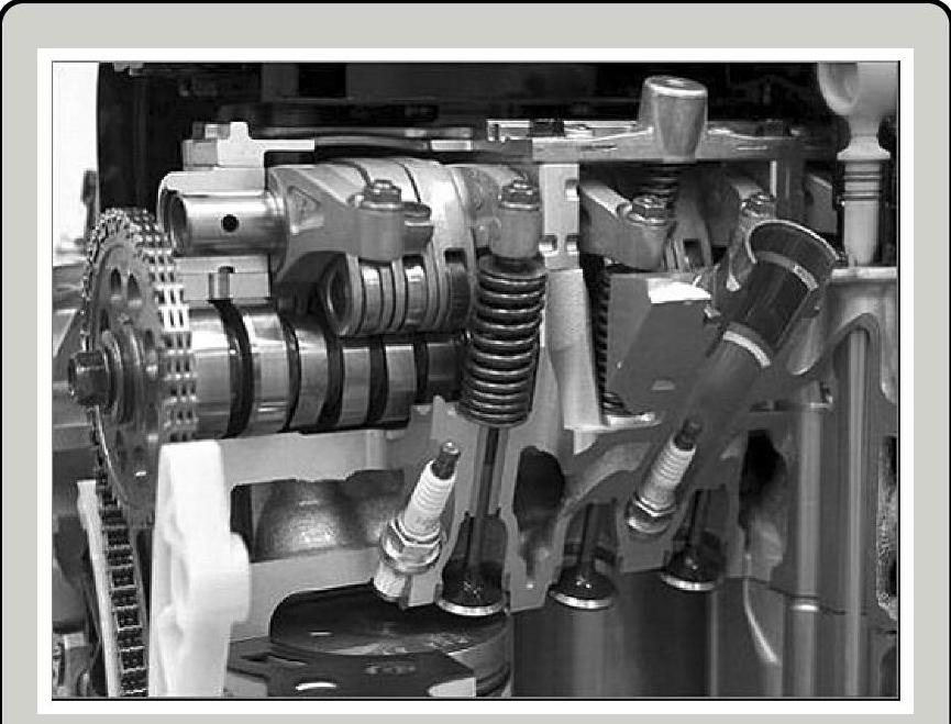 在日常行车中,经常会遇到这种情况,如堵车时,装备了MIVEC系统的发动机比普通发动机能节省很多燃料。而另一种情况就是当需要加速或高转速行驶时,MIVEC系统会让两个进气门同时以同样的最大升程开启,这时的进气效率能显著提高,令发动机在高转速运转时能有充足的储备。图1-52所示为装备MIVEC系统发动机的剖面图。