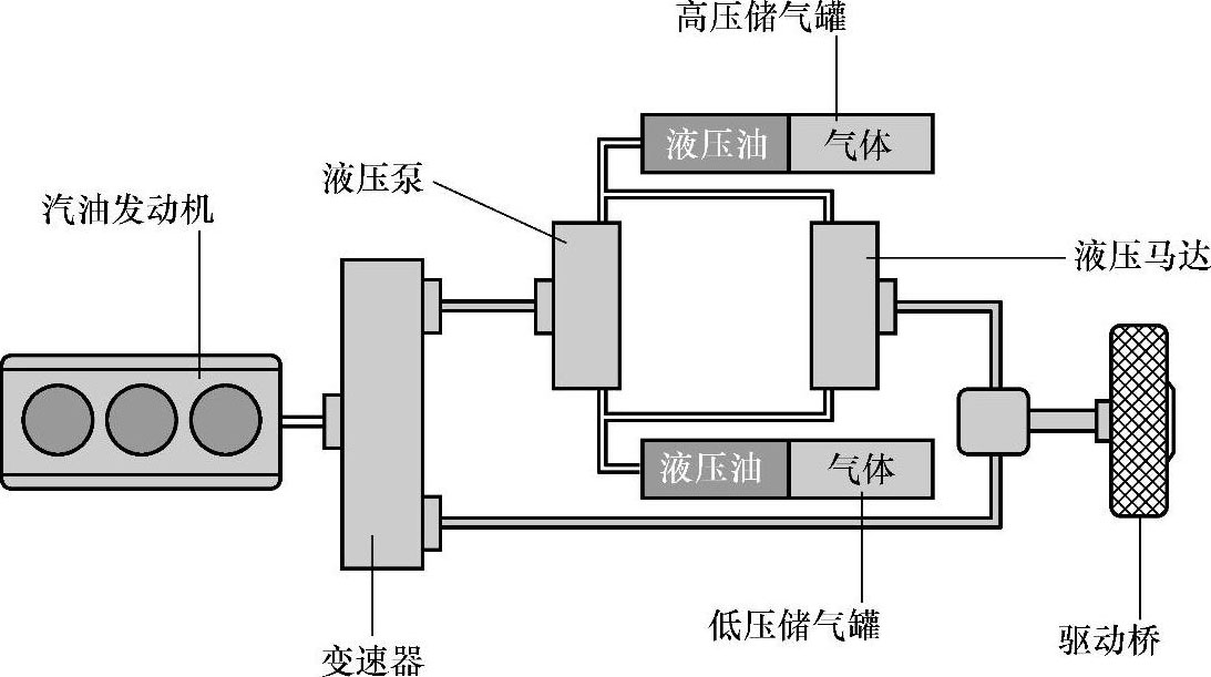 由图1-3的结构图可以看到,压缩空气能量的释放,是利用液压油推动液压机构(液压泵和液压马达),进而将动力传递到驱动桥的。而制动能量的回收,也是通过液压机构,用液压油来压缩空气存储能量的。