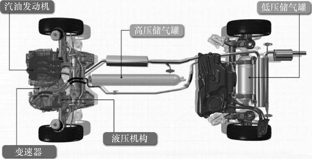 这套空气混合动力系统主要包括3部分,即汽油发动机动力总成、液压泵/液压马达和压缩空气系统(图1-2)。其中液压泵、液压马达与变速器是整合在一起的。