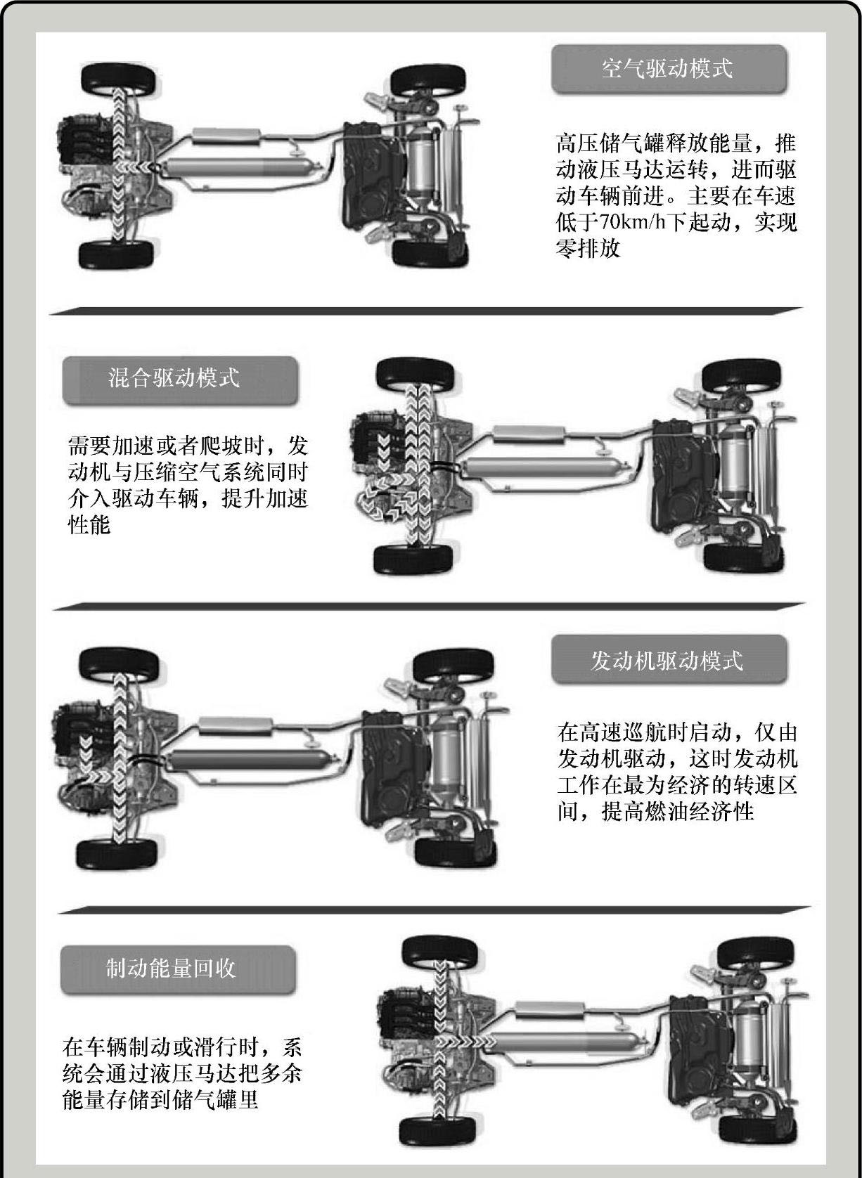 空气混合动力系统与油电混合动力系统类似,包括4种行驶驱动模式(图1-4):空气驱动模式、混合驱动模式、发动机驱动模式和制动能量回收。其中,发动机驱动模式主要用于高速定速巡航(这也是发动机最经济的工作区间);纯空气驱动主要用于城市道路(车速不超过70km/h);而需要加速或爬坡时,两者同时介入工作。最后就是制动能量回收,这与电机回收电能存储于电池有所差别,它是以压缩气体的形式储存于储气罐中的。