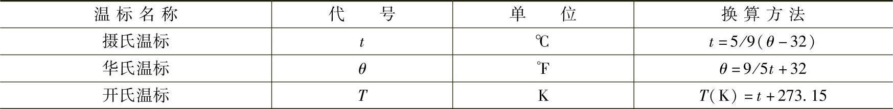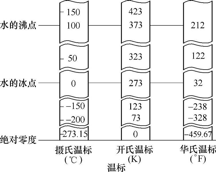 (1)温标 温度计上的标尺称为温标,工程上常用的温标有:摄氏温标,用℃表示;热力学温标,用K表示;华氏温标,用℉表示。用这三种温标测得的温度分别为摄氏温度、热力学温度和华氏温度,如图1-1所示。