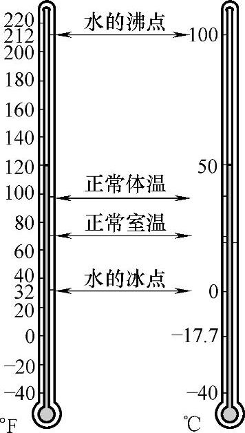 在我国,表示温度通常使用摄氏温标,在欧美,华氏温标使用比较普遍,三种温标的比较换算见表1-1。温标对照如图1-2所示。