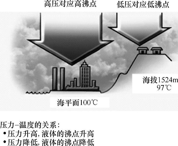 蒸发与沸腾虽然同属于汽化现象,但在一定压力下,蒸发可以在任何温度下进行,而沸腾只能在到达与液体表面压力相对应的一定温度(沸点)时才能进行。液体沸腾时的温度称为沸点,又称为该压力下的饱和温度,该压力称为饱和压力。液体的沸点与它的表面压力有直接的关系,压力越高,沸点越高,如图1-6所示。