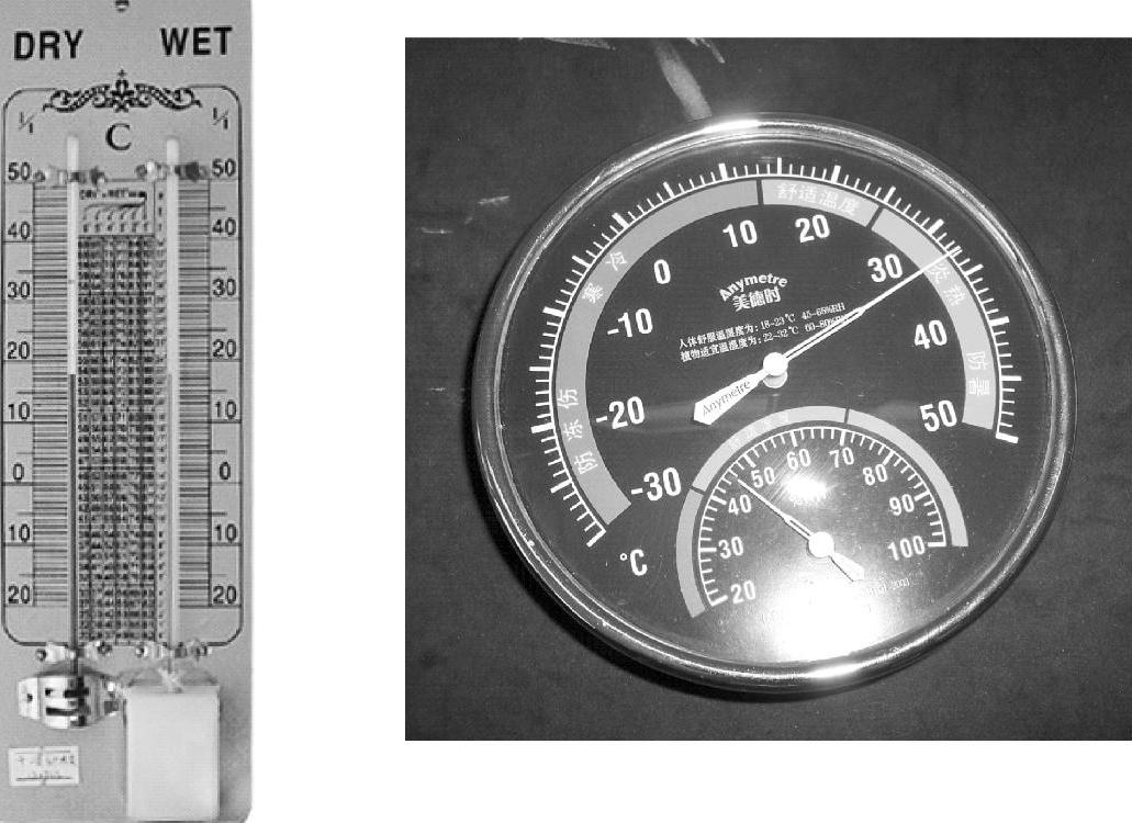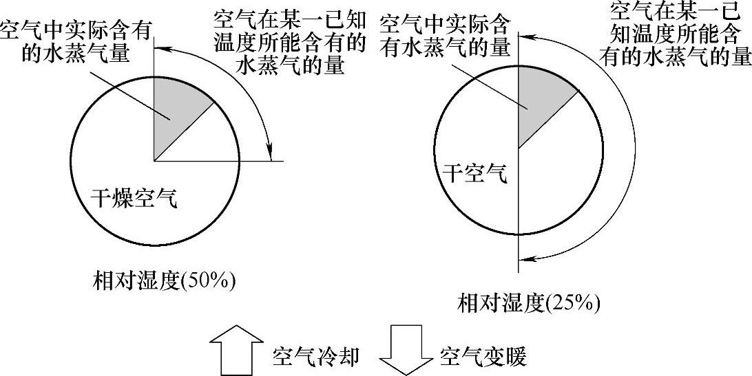 (3)相对湿度和绝对湿度 通常空气中水蒸气的最大含量,随温度不同而异;空气温度较高时,水蒸气的最大含量要比温度较低时大。湿度大小有两种表示方法,一种叫相对湿度,另一种叫绝对湿度。